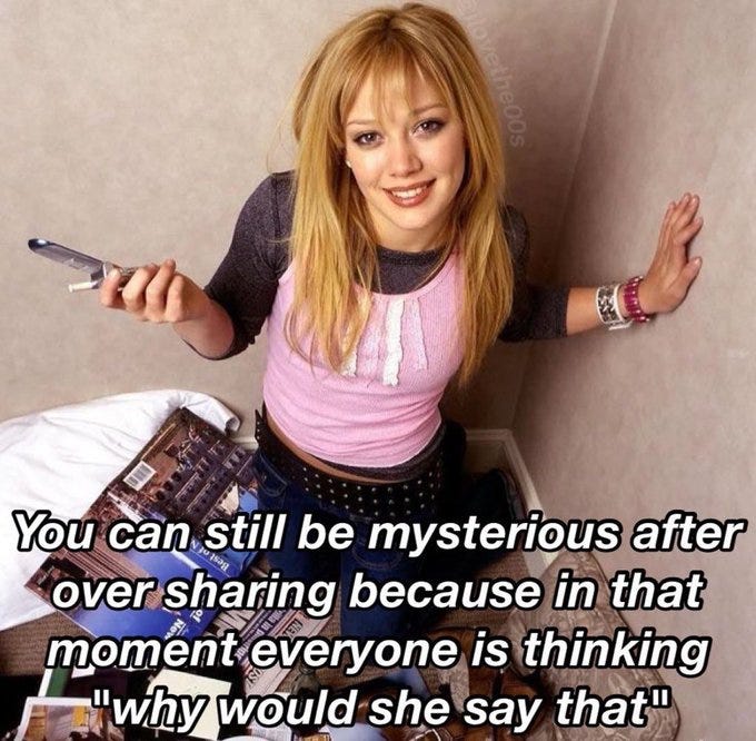 . Not a traditional essayist at all, Cat hosts a podcast near and dear to my heart - Seek Treatment - with her best friend Pat Raegan. She sings in the theme song, “You wished for a sign from above, well here’s a podcast about boys, sex, fucking, dating, and love.” She muses about her relationship with her longterm boyfriend Brian, living in the West Village, and the ennui of her charmed life. Her overshares are like streams of consciousness as she discusses a recent threesome with her partner and a woman with big boobs. In her book of poems, God I Feel Modern Tonight, and in her W Mag advice column, she weaves her overshares into beautiful prose. Cat is also, more famously, a stand up comedian who makes crowds laugh while singing about her Apple Watch and a future memoir. If I were ever to perform live, my wish would be to be like Cat. She is engaging and true and funny and self deprecating and a wonderful oversharer.So my deep dive results are a mixed bag. I’m both Carrie and Dolly and Cat. A CDC, without the mandates on vaccines. I take the pieces of each and inject them into my work, sparkled with the oversharing magic that is unique to me. What we all have in common is our obsession with perceiving the world as though we are the main character. Carrie does this by constantly talking about Mr. Big, her relationship with Big, if Mr. Big is moving to Paris, Big, Big, Big. Dolly does this by telling the story of love with touch points throughout her entire life, remembering details about being thirteen that normal people forget, but writers have burned into their minds. And Cat does this by parroting the girls on TikTok who believe they are the main characters of the world, twisting their realities until she is the main character they dreamed of being.